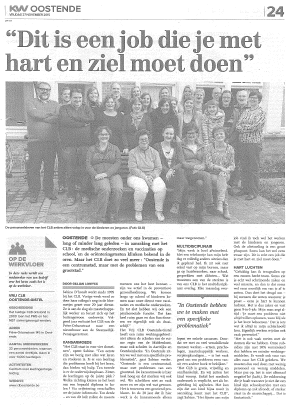 Vorige week op 27 november verscheen een mooi artikel over VCLB Oostende-Gistel in de Krant van West-Vlaanderen, KW Zeewacht. Sabine D'hondt legt de werking van het CLB uit, legt de stedelijke problematiek van Oostende uit en zet meteen ook het hele team in de bloemetjes.                            |