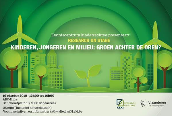 Wat zijn de nadelige effecten van ons veranderend leefmilieu? Wat zeggen kinderen en jongeren er zelf van? Hoe kunnen we kinderen en jongeren stimuleren om duurzaam gedrag te stellen? Dat zijn de vragen waarop het Kenniscentrum Kinderrechten (KeKi) op hun jaarlijkse Research on Stage dieper zal ingaan.   Danielle Van Kalmthout (UGent) brengt er vanuit een juridische insteek haar onderzoek m.b.t. milieurechten en de positie van kinderen daarbinnen. Aan interactieve onderzoekstafels worden naast belevingsonderzoeken van kinderen en jongeren (VVJ) ook concrete acties voorgesteld vanuit jongerenorganisaties (o.m. Globelink). Het Kinderrechtencommissariaat verzorgt het afsluitende woord. Op het event staat vooral de expertise van het publiek centraal. Aan de hand van begeleide rondetafelgesprekken ga je op zoek naar inspirerende praktijken en beleidsaanbevelingen.  Keki’s Research on Stage vindt plaats op dinsdag 16 oktober 2018 van 12.00 u. tot 16.00 u. in het ABC Huis te Brussel. Deelname kost 35 euro. Nog vragen?  Contacteer Ellen Van Vooren. Inschrijven kan via kathy.vlieghe@keki.be.                         |